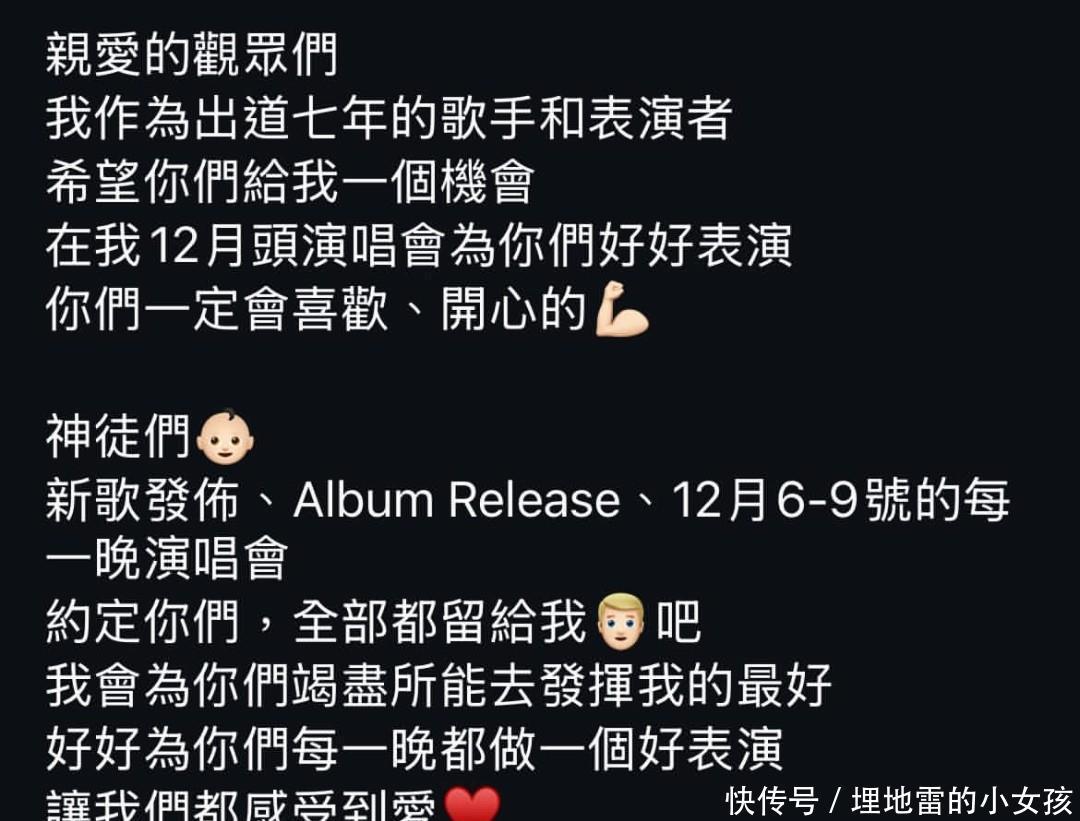至于后三场,三种规格的门票都有大量代售,甚至能够轻松买到六连位。为提振票房,卢瀚霆于22日在Instagram发文,号召粉丝入场支持:“亲爱的观众们,我作为出道七年的歌手和表演者,希望你们给我一个机会,在12月的演唱会上,我会为你们好好表演,你们一定会喜欢、开心的……12月6日-9日,每一晚演唱会,约定你们,(把时间)全部都留给我吧!我会为你们竭尽所能去发挥到最好,好好为你们每一晚都做好表演,让我们都感受到爱!期待每一晚都见到你们每一位。”